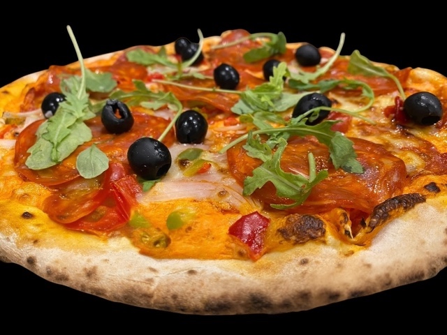 tomate, chorizo, anchois, oignons, poivrons, olives, mozzarella